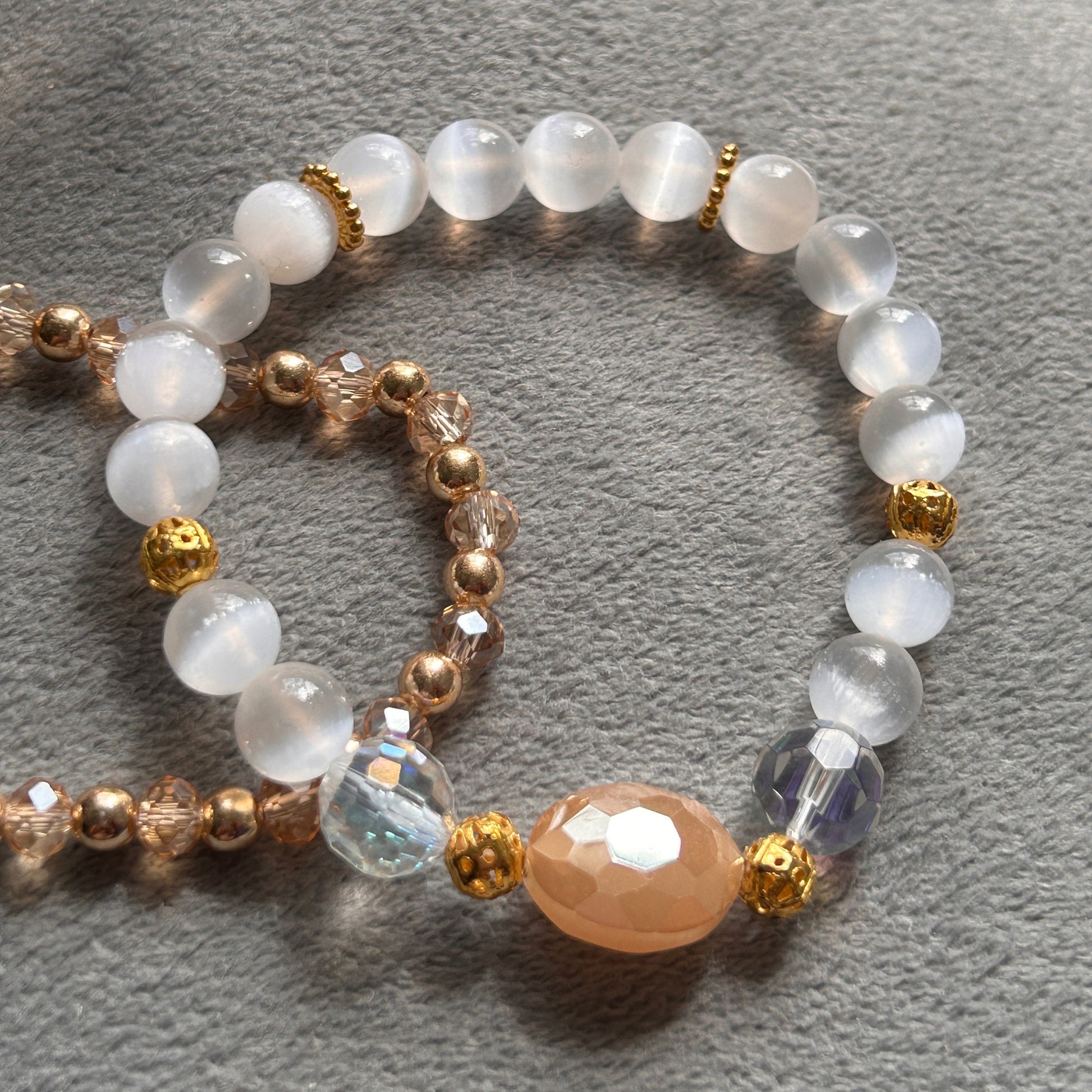 -8mm Selenite crystal beads: Smooth, translucent white beads known for their cleansing and protective properties.