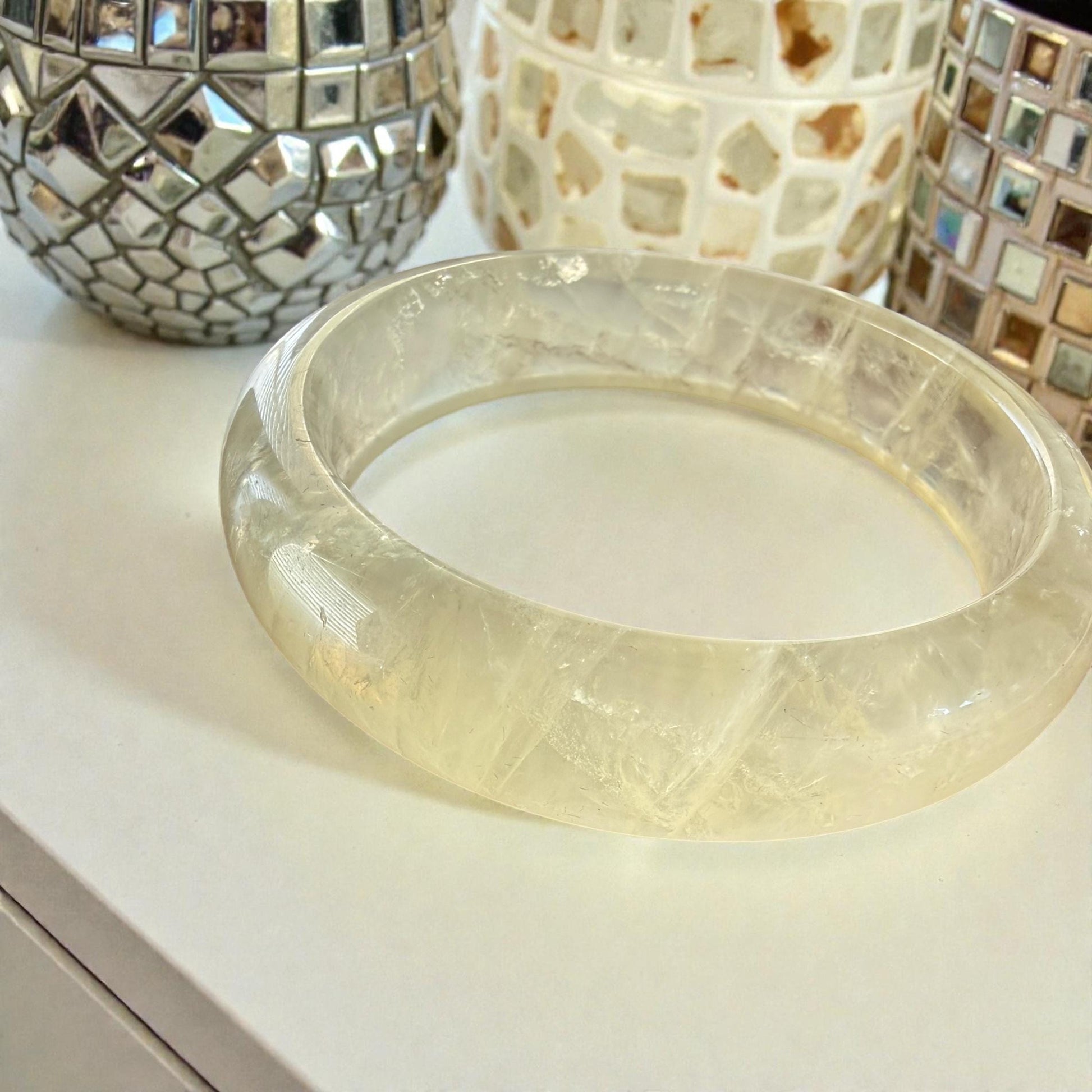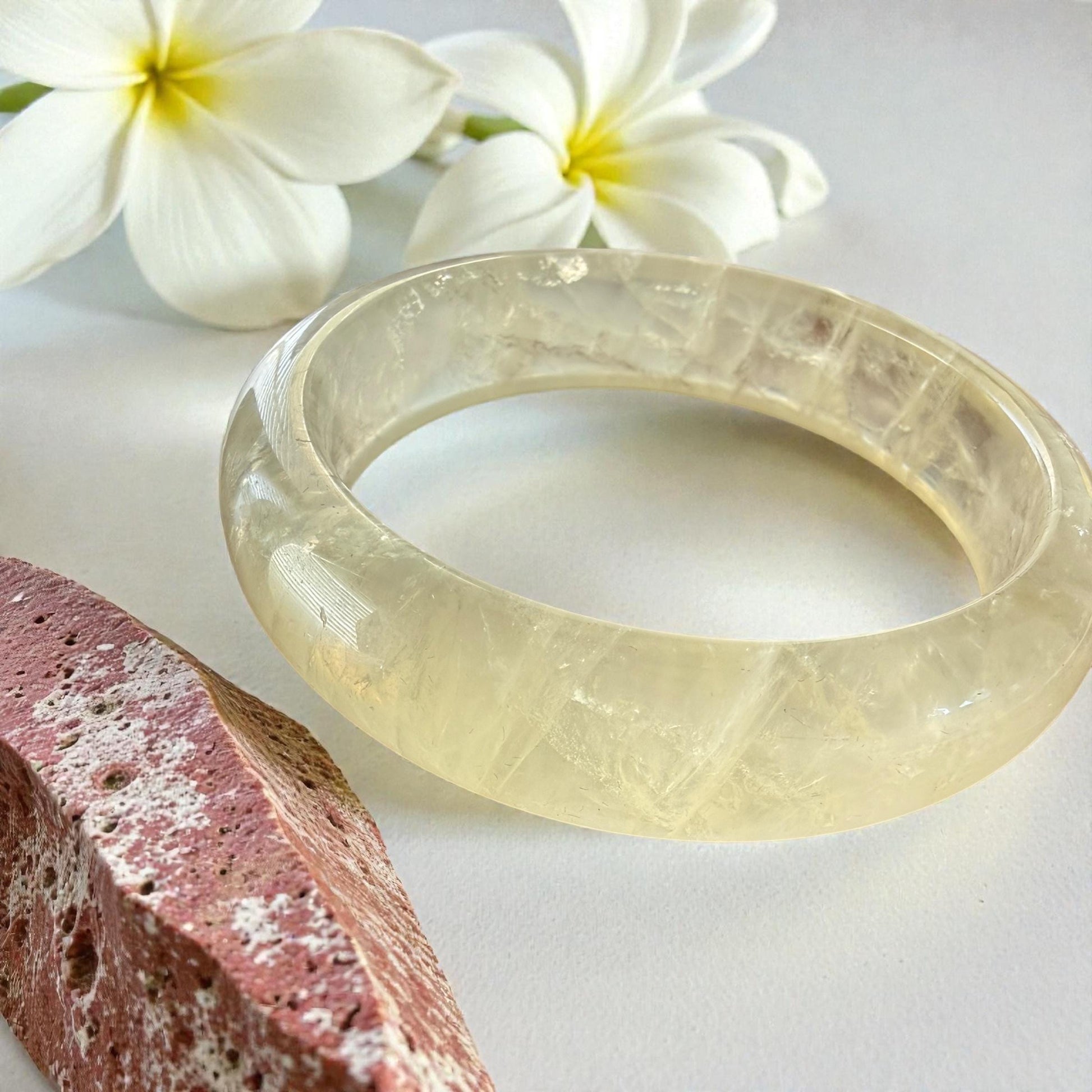 This radiant bangle is carved from authentic Golden Healer Quartz, a stone known for its warm golden glow and gentle uplifting energy. It carries that soft creamy tone that collectors recognize as Milky Quartz, with natural cloud like veils swirling inside the stone.