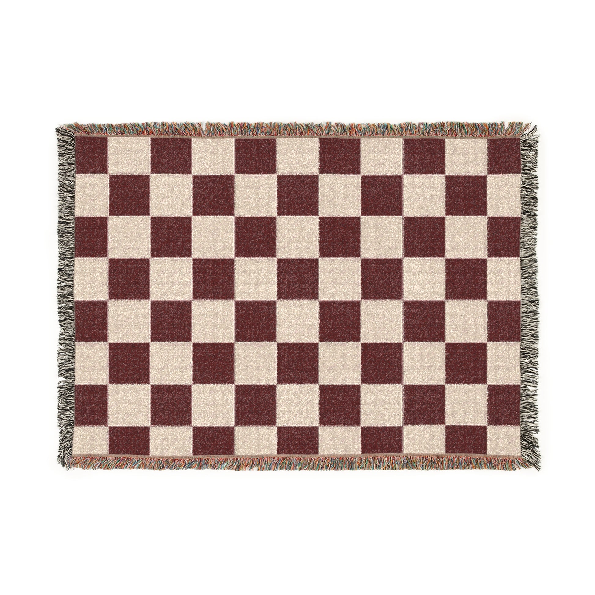 Elevate your home's aesthetic with our luxurious Checkerboard Woven Blanket, a perfect blend of modern design and cozy comfort. Featuring a sophisticated pattern of deep burgundy and soft beige squares, this premium throw adds a warm, rich, and contemporary touch to any room. Expertly crafted from 100% soft, durable cotton threads, its tightly woven surface is finished with elegant fringed edges, creating an artisanal look and tactile depth that exudes a high-end editorial feel. Draped effortlessly over a sofa, folded at the foot of a bed, or snuggled in a reading nook, this warm luxury aesthetic blanket provides quiet warmth and a clean, modern design that ages beautifully with use. Note: Mockups are illustrative; the woven texture creates unique subtle variations in color and edge appearance.