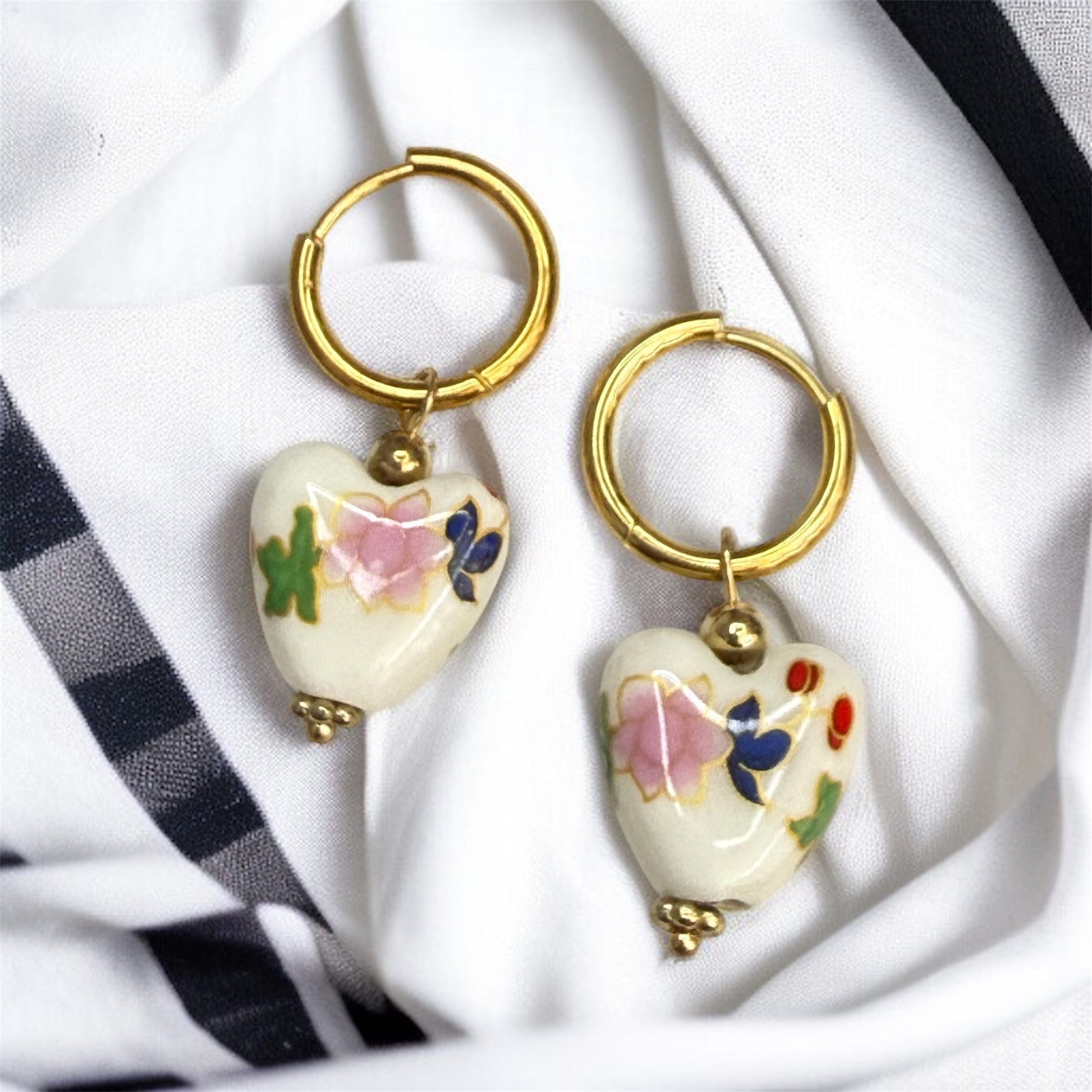 Porcelain Heart Earrings – Blue Floral Ceramic Dangles on Gold Hoops