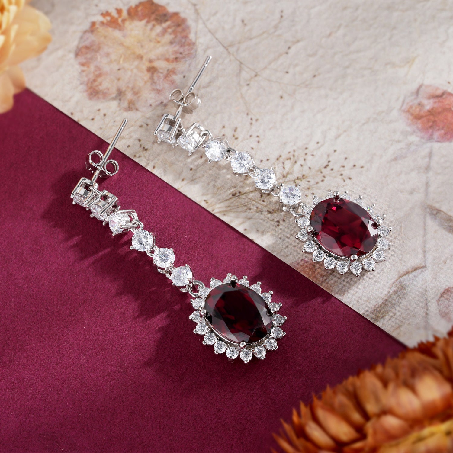 Dazzle from day to night with these Red Garnet & CZ Drop Earrings in S925 Silver! Each earring features a stunning 8x10mm natural deep-red stone (approx. 5ct each), surrounded by a sparkling halo of cubic zirconia and suspended from a row of shimmering white stones. Set in pure 925 sterling silver, these geometric ellipse earrings are the very definition of light luxury—perfect for women who love modern elegance with serious impact.